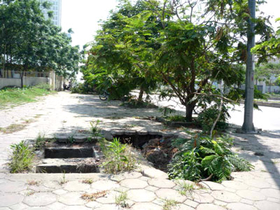 Chỉ 100 mét vỉa hè mà có đến 20 cống không nắp đậy. Dưới cống là đủ các loại rác thải, nào túi nilông, hộp cơm, đất đá… do người đi đường ném xuống. Chưa hết, vỉa hè nhiều đoạn bị sụt lún nghiêm trọng, có chỗ lún sâu tới 40 – 50 cm và bề rộng lên đến hàng mét.