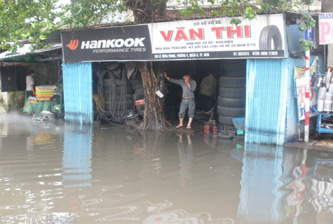 (VTC News) – Theo báo cáo của Trung tâm điều hành chống ngập nước TP.HCM, cơn mưa kéo dài khoảng gần 3 tiếng vào rạng sáng nay (13/4) đã gây ngập cho khoảng 56 tuyến đường và 58 điểm ngập nặng trên toàn TP. > Giao thông TP.HCM hỗn loạn do ngập nước Ngập nặng nhất là các quận 1, 4, 5, 6, 10, 11, Bình Thạnh và Tân Bình và các tuyến đường như Đỗ Ngọc Thạnh, Phùng Hưng, Hải Thượng Lãn Ông, Châu Văn Liêm, Hồng Bàng (Q.5), Âu Cơ (Tân Bình), 3 tháng 2, Lê Hồng Phong (Q.10)… Do mưa lớn và kéo dài nên đã gây ra tình trạng ùn tắc giao thông, kẹt xe rất nghiêm trọng tại hầu hết các tuyến đường ở khu vực nội thành TP.HCM trong sáng nay. Do ảnh hưởng của việc ngập nước do cơn mưa rạng sáng 13/4, cơ sở vỏ xe Văn Thi đã bị ngưng trệ việc kinh doanh cả buổi sáng nay (ảnh: N.D) Rất nhiều cán bộ công nhân viên và các em HS – SV đã phải đến trường, đến Sở làm trễ do xe chết máy. Cũng có khá nhiều xe buýt và xe taxi đã không thể di chuyển nổi trong sáng nay. Theo ông Đỗ Tấn Long – Trung tâm điều hành chống ngập nước TP.HCM thì tuy đây chỉ là một cơn mưa chuyển mùa, lượng mưa chưa quá cao nhưng có thể nhận thấy rằng hệ thống thoát nước của TP không được cải thiện nhiều. Ông Long cho biết sau khi các nhân viên của trung tâm này kiểm tra thì bước đầu, có thể nhận định rằng nguyên nhân gây ngập là do nước thoát ra tại các cửa sông rất chậm. Một số cửa sông đã bị bít lại bởi dự án Đại lộ Đông Tây đang thi công.