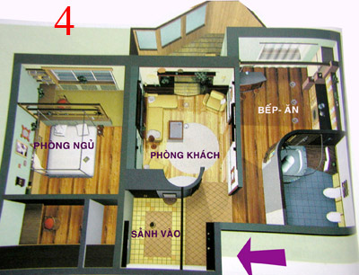 Ta có thể xem xét ví dụ ở hình 3 và hình 4 để thấy việc bố trí của một căn hộ nhỏ nhưng có sự phân định chủ khách khá rạch ròi: phòng khách được hướng tầm nhìn ra ban công có tiểu cảnh thiên nhiên, còn giữa bếp và khách có cửa trượt để ngăn tầm nhìn cũng như giảm khói mùi lan tỏa.