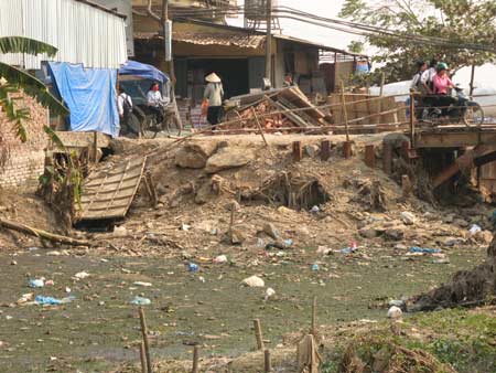 | rác thải tràn ngập cả hai bờ và dưới lòng kênh. |