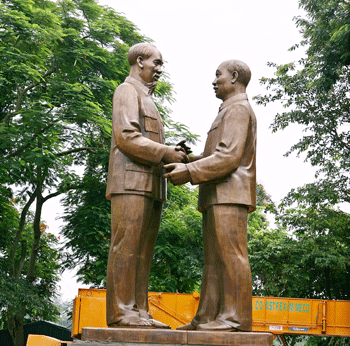 Đến thời điểm này trung tâm bảo tồn và phát huy giá trị di tích lịch sử văn hóa Tp HCM tại Công viên Thống Nhất (Hà Nội) do Cty Cp Xây lắp Cơ giới và Đầu tư Thương mại Constrexim (Constrexim Meco) thi công đã hoàn thành khối lượng lớn công việc. Ông trần Ngọc Anh, Tổng Giám đốc Constrexim Meco cho biết: mặt bằng thi công chật hẹp, nền đất yếu lại yếu, nhiều cây cối và nhiều người qua lại, địa điểm thi công trong nội đô nên việc vận chuyển nguyên vật liệu không đơn giản….đã gây không ít khó khăn cho đơn vị thi công. Tuy nhiên, với quyết tâm hoàn thành công trình trước Đại lễ 1000 năm Thăng Long – Hà Nội, Constrexim Meco đã huy động lực lượng làm 3 ca không kể ngày đêm. Không chỉ đẩy nhanh tiến độ dự án mà chất lượng công trình được đơn vị thi công đặc biệt chú ý. Thi công trên nền đất yếu, bức tượng Bác Hồ – Bác Tôn được đúc bằng đồng Ucraina nặng trên 20 tấn đã được Constrexim Meco sử dụng các biện pháp tiên tiến gia cố móng đặc biệt với hệ thống lưới cọc dày, sâu 30 m, đảm bảo bức tượng vững chắc, không lún. Sau khi được chuyển từ Sài Gòn ra Hà Nội trên chuyến tàu đặc biệt mang số hiệu 732, sáng 23/7, tượng được rước từ ga Giáp Bát về và dựng tại Công viên Thống Nhất. Bức tượng thể hiện tư thế Bác Hồ bắt tay chúc mừng Bác Tôn sau khi Bác Tôn được Quốc hội khóa II năm 1960 bầu vào chức vụ phó Chủ tịch nước Việt Nam Dân chủ Cộng hòa. Điều đặc biệt của bức tượng nằm ở động tác bắt tay, nhịp tay Bác Hồ trên tay Bác Tôn như lời nhắn gửi, Bác Tôn nâng tay đỡ trân trọng. Theo ông Hứa Ngọc Thuận, phó Chủ tịch UBND TpHCM, đây là công trình mà Đảng bộ và nhân dân TpHCM gửi tặng Đảng bộ và nhân dân Thủ đô nhân dịp Đại lễ, đồng thời thể hiện sự tôn vinh, trân trọng, tình cảm kính yêu của nhân dân đối với Bác Hồ – Bác Tôn. Bức tượng còn thể hiện tình đoàn kết Nam – Bắc một nhà. Đặt tại Công viên Thống Nhất, bức tượng là biểu tượng của niềm khao khát non sông liền một dải từ những năm kháng chiến. Gương mặt của hai vị lãnh tụ sẽ hướng về phương Nam, như Bác Hồ lúc sinh thời từng nói: “Miền Nam luôn trong trái tim tôi!”. Tượng cao 5,4 m, đặt trên bệ cao 1,8m nặng được đặt tại đảo Thống Nhất có diện tích hơn 6.000m². Sau khi lắp đặt thành công bức tượng, Constrexim Meco đang tiếp tục đẩy nhanh tiến độ thi công dự án, hoàn thiện sân vườn và hạ tầng Đảo… Dự kiến công trình sẽ khánh thành vào đúng dịp Đại lễ. |