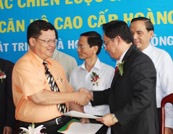 Đại diện Công ty HAGL Land và AB Land bắt tay nhau sau khi ký kết hợp đồng trở thành đối tác chiến lược của nhau. Ảnh: Vũ Lê.