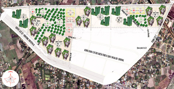 – Bố trí các công trình có tính chất quan trọng và hình thức kiến trúc đặc thù tại các trục đường lớn, những lô đất tiếp giáp với các tuyến đường này đều được cân nhắc về hình dáng và diện tích để dễ dàng tạo các điểm nhấn về cảnh quan kiến trúc (quốc lộ 22 và tỉnh lộ 7).