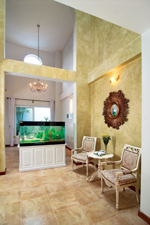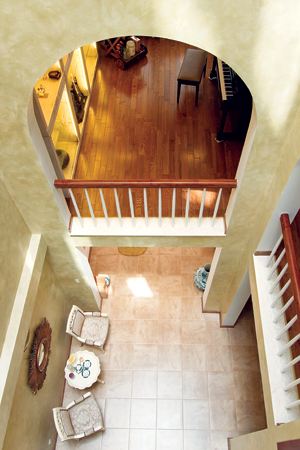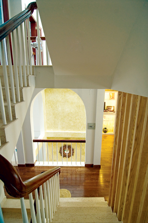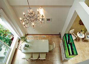 Bằng cách tạo một khoảng thông tầng tương đối rộng từ dưới lên đến tận nóc, các không gian chung đều áp sát và mở ra khoảng thông tầng này, tạo nên những góc nhìn khác nhau ở nhiều vị trí. Bên cạnh đó kiến trúc sư còn tạo thêm khoảng thông tầng thứ hai từ dưới lên lầu một ở khu vực bàn ăn. Sự kết hợp của hai khoảng thông tầng này làm tăng thêm cảm giác thư giãn.