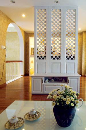 Phòng khách chỉ ngăn cách với phòng thư giãn bởi một vách trang trí nhỏ