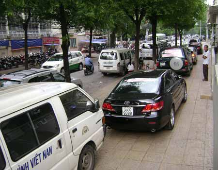 Ô tô giăng thành hàng trên hè phố bao vây quanh tòa cao ốc Tản Đà để phản đối mức thu phí giữ xe của chủ đầu tư. Ảnh: S.T. |