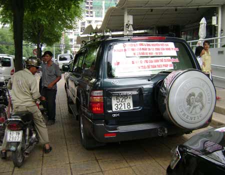 Ô tô có dán biểu ngữ tố chủ đầu tư cao ốc Tản Đà thu phí giữ xe sai quy định. Ảnh: S.T. |