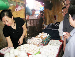 Thấy chúng tôi nêu lý do cần mua trứng với số lượng lớn để nấu ăn cho cơ quan, nên nhất định phải có giấy chứng nhận kiểm dịch và nguồn gốc xuất xứ, chị H. đổi thái độ, ngọt nhạt: “Nếu em cần trứng số lượng lớn thì một tuần chị sẽ cho người chở đến tận cơ quan em. Còn giấy tờ thì lo gì, em cần mai chị có ngay. Nhưng tội gì em lấy trứng ấy cho đắt ra, trứng này ăn cũng ngon, mà giá rẻ hơn”.