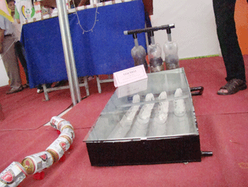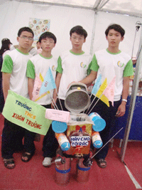Với nguyên liệu là những lon sữa, hộp bánh, vỏ hộp coca… trông chú robot rất oai vệ và ngộ nghĩnh. Đây là sản phẩm của 4 em học sinh trường trung học cơ sở Xuân Trường – Thủ Đức. Bạn Nguyễn Hoàng Anh cho biết, sau cuộc thi này sẽ thiết kế cho mỗi lớp học một chú robot để các bạn trong lớp có ý thức hơn về việc giữ gìn vệ sinh trường lớp.