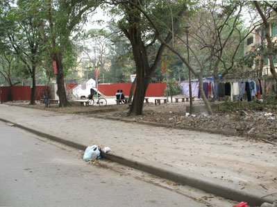 Thế nhưng, không hiểu sao chính quyền cứ nhất mực “chấm” sân chơi Con Voi để xây chợ? Phải chăng vì lập dự án tại sân này ít bị đền bù, giải phóng mặt bằng? Để nguyên là một sân chơi thì không “ra tiền” trong khi các khu đất trống khác cùng khu vực tuy không phải sân chơi công cộng nhưng vẫn đang là “nồi cơm” nên không dễ gì giải tỏa??? Mục sở thị sân chơi Con Voi tháng 2/2009, “lá phổi xanh” đã bắt đầu bị xây tường bao quanh, không biển báo, không một dòng chữ cho biết đang tiến hành gì trên khu đất công cộng này! Sân Con Voi đã bị chiếm, chỉ còn chừa một góc vừa khuất vừa ngập rác, thế mà vẫn có những người thèm khát không gian xanh đến mức kéo ra ngồi “xả hơi” vớt vát tại góc còn sót lại của sân chơi một thời này… “Chúng tôi nói thật là không đồng tình. Trên quyết thì phải chịu thôi, nhưng mà chẳng ai thấy hợp lý và đồng ý cả! Tự dưng trẻ em mất chỗ chơi, người lớn mất chỗ tập thể dục. Chợ họp thì 2 -3h đêm đã ồn ào đến tối, mất vệ sinh, tắc giao thông. Học sinh các trường quanh đây (Trung Tự, Kim Liên, Lê Quý Đôn…) mà tan đúng tầm đi chợ thì chỉ có mà nghẽn nặng!” – bà Đỗ Thị Uốn phòng 405 G1 Trung Tự bức xúc. Người dân cũng cho biết, trước Tết, bỗng nhiên thấy ùn ùn chở gạch đến sân chơi rồi xây tường bao, chẳng biết khởi công hay khởi động lúc nào mà rất lặng lẽ?! Đến lúc này, đông đảo người dân vẫn chưa được biết thiết kế hay mô hình, phối cảnh cái chợ sẽ “ngoạm” sân chơi của họ ra sao, bởi chưa được thông báo, cũng không một dòng “chú thích” tại nơi trước kia là điểm vui chơi, sinh hoạt cộng đồng của họ…