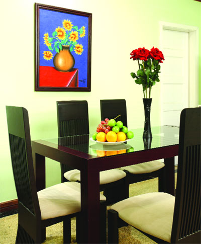 Căn hộ rộng 112m2, với ba phòng ngủ, ba toilet, chưa kể phòng khách, bar và gian bếp ấm cúng. Ban ngày, vợ chồng song “Ngọc” thường mở tung hết cửa sổ đón không gian thừa nắng và gió, mở ra những khoảng nhìn thoáng đãng tuyệt đẹp từ trên cao. Cũng tại không gian này, nhà MC Ngọc Nga đã giữ gìn một văn hóa nghe nhạc khá lãng mạn với dòng world music, jazz, flamenco.