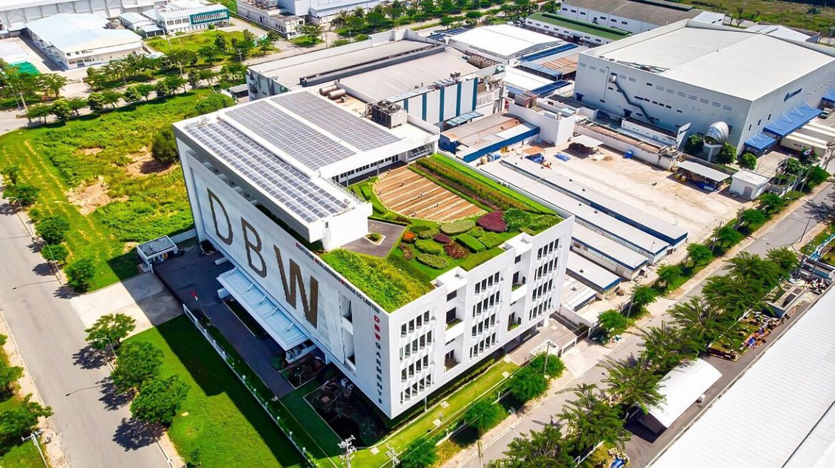Nhà máy DBW nổi bật với thiết kế công trình xanh đạt chuẩn bạch kim LEED và LOTUS, là một tác phẩm tiêu biểu của VEV. Công trình tận dụng năng lượng xanh, tối ưu hóa không gian và tạo môi trường làm việc trong lành. Với diện tích chỉ 5.000m², công trình 5 tầng được thiết kế thông minh, gồm văn phòng, nhà xưởng, nhà kho và khu vực ăn uống. Đây là hình mẫu lý tưởng cho xu hướng phát triển bền vững trong ngành công nghiệp sản xuất.