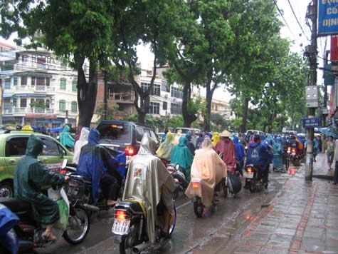 Ai cũng vội chạy mưa nên lao xe cả lên vỉa hè. |
