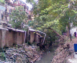 Từ lâu, nơi này đã có dự án làm cống hoá, biến dòng mương thành một con đường rộng 13,5m nhưng đến nay vẫn chưa tiến hành. Cũng dòng mương này, nhưng ở phía đối diện, có hẳn một dãy nhà tạm siêu mỏng dựng ngay sát mương. Khu nhà tạm này trông như những công trình phụ bổ sung cho khu tập thể cũ ngay bên cạnh. Không khí vốn đã ẩm ướt nên khi đi vào khu nhà tạp này, chúng tôi thấy có cái gì đó rất ngột ngạt. Nếu không đi vào sâu, chúng tôi không biết trong đây có hàng cơm bụi.