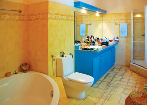 | Cũng có một số đồ gỗ được tìm từ các cửa hàng trang trí trong thành phố | Mỗi phòng đều có nhà tắm với màu sắc riêng |