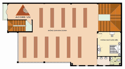 Tầng 1 và 2, phía trước mảnh đất, chừa ra một khoảng diện tích rộng làm garage để xe cho khách. Không gian trung tâm được sử dụng làm nơi kinh doanh, mua bán. Quầy thu ngân được đặt ngay phía cửa ra vào để thuận tiện hơn cho việc thanh toán của khách hàng. Chúng tôi bố trí phòng nghỉ nhân viên, khu vệ sinh ở phần diện tích phía sau để không làm ảnh hưởng đến không gian bán hàng. Không gian dưới cầu thang cũng được tận dụng để làm kho chứa đồ.