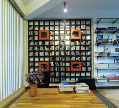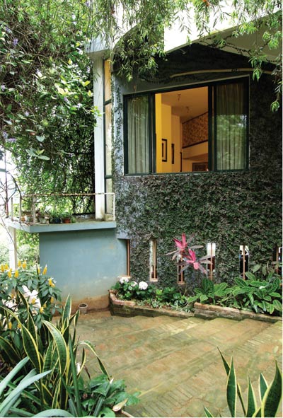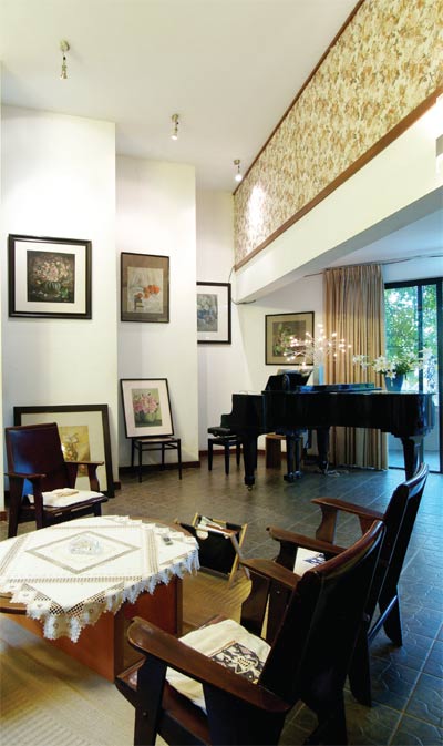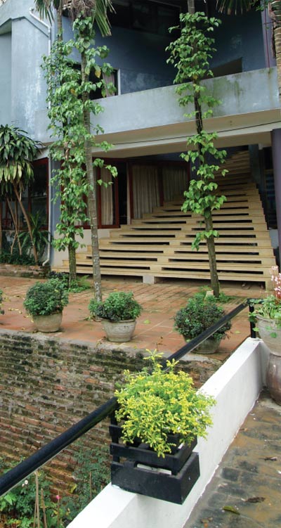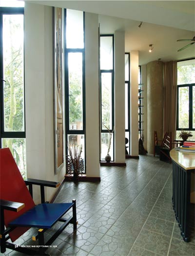 ban công trên tầng lầu, nơi hương cau đổ vào nhà, là chỗ nữ họa sĩ – chủ nhà có thể hoàn toàn trao gửi cảm hứng trên toan vẽ với những sắc màu nguyên gốc dưới ánh sáng tự nhiên. và thiên nhiên sinh động trở lại gần gũi trong mỗi bức tranh hoa cỏ của bà. góc của người trẻ tuổi dường như thực tế hơn với những bố cục chặt chẽ của giá để đĩa hát, kệ để tạp chí, sách vở, hoặc của chiếc bàn làm việc dành cho những bản vẽ kiến trúc và máy tính… hai căn phòng bố cục không gian giống nhau, nhưng đã rõ là hai thế hệ, hai nghề nghiệp: với kiến trúc sư là chặt chẽ hơn, với họa sĩ – pianist là tự do hơn, phóng khoáng hơn. như một lời khẳng định: chỉ có chính ta mới hoàn thiện được phong cách kiến trúc cho nơi sống của mình, họ gửi vào mỗi góc sống cái tôi theo thời gian. những điểm nhìn từ trong phòng ra ngoài không trực tiếp, mà có lớp lang, chính phụ bằng sự tham gia của các chi tiết kiến trúc và những mảng sân, vườn hay tiểu cảnh.