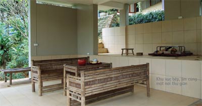 cả nhà yêu bạn bè, nên ở đây, bếp là nơi thư giãn ấm cúng nhất. khu bếp có thật nhiều chỗ ngồi, trong ngoài đều thật gần với vườn, nhiều lối vào ra, hết sức mở… vật dụng nhà bếp cũng tham gia vào “bức tranh sắp đặt” có ý tứ – đó là sự chan hòa tự nhiên mà người khách nào đến đây cũng cảm thấy được. sự chuyển tiếp của không gian từ nhiều góc của ngôi nhà nối với bên ngoài, với sân, với những lối ra vườn… là ý tưởng từ ban đầu của tác giả, giờ đây càng rõ ràng hơn.