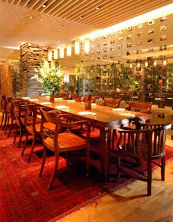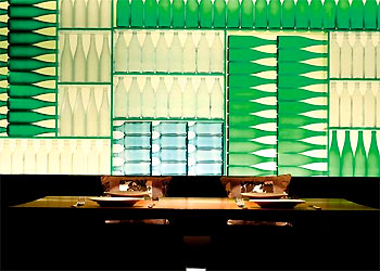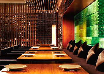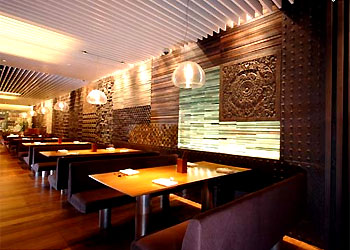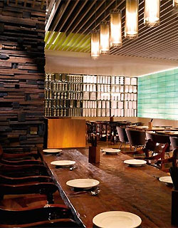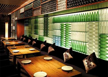 Có thể nói, StraitsKitchen đã sử dụng vật liệu một cách tinh tế để tạo nên không gian nội thất độc đáo và hiện đại. Bất kỳ ai khi bước vào cũng ấn tượng bởi những mảng tường được trang trí ấn tượng, không khác gì những tác phẩm sắp đặt. Gỗ, kim loại, sành sứ, chai lọ… khi được bố trí trên những mảng tường sẽ trở nên “có một không hai”. Trên trần, những lam gỗ cũng làm cho không gian trở nên gần gũi và ấm cúng. Tác giả của những tác phẩm này chính là một nhà thiết kế người Nhật.