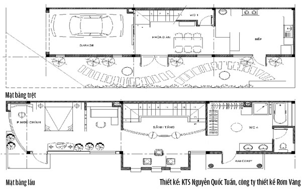 Lô đất 6 x 20m, nhưng nhà chỉ được xây với diện tích 4 x 16m. Để tầng trệt, phần sân vườn được bố trí trên hai mét đất dọc suốt chiều dài căn nhà. Và chủ nhà đã đạt được mục đích: ở chật một chút nhưng rộng tầm mắt