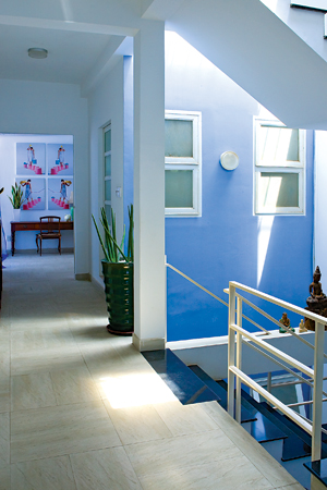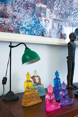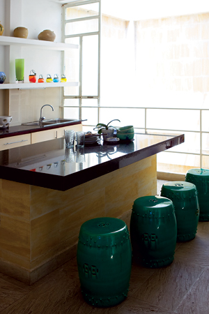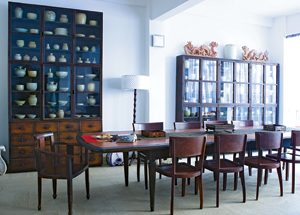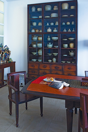 Nếu như kiến trúc căn nhà thiết thực cho một không gian làm việc thì nội thất lại được chủ nhân chăm chút bằng vốn hiểu biết và tình cảm mạnh mẽ với những món đồ mà anh sưu tập được. Từ bình Hán, lọ Lý, đĩa Chu Đậu thời Trần đến gốm cổ Biên Hoà, men lam xứ Huế,… tới cả những món đồ thuỷ tinh nước ngoài và gốm mới từ các lò Bình Dương, Bát Tràng… Tất cả đều song hành cùng nhau, tạo nên một không gian sống – làm việc đầy hứng khởi cho một hoạ sĩ đương đại.
