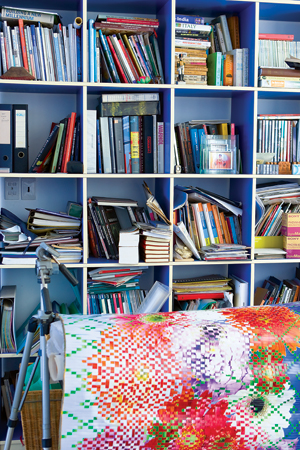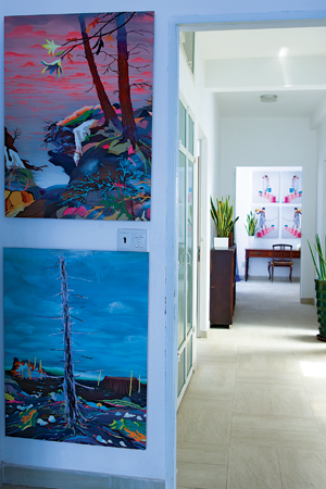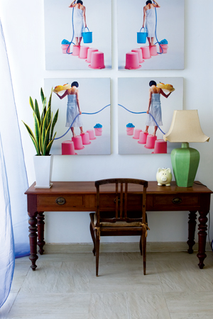 Không gian giữa các phòng dường như bị xóa bỏ bởi lối thiết kế hành lang và cửa đi rộng rãi | Hoạ sĩ bên cạnh một trong những tác phẩm yêu thích của mình |