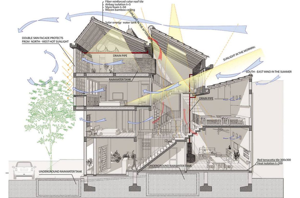 Cửa sổ rộng, lam che nắng, vật liệu cách nhiệt và giếng trời giúp kiểm soát nhiệt lượng xâm nhập, đồng thời duy trì ánh sáng tự nhiên. Kết hợp hiệu ứng ống khói (khí nóng thoát lên cao) và hiệu ứng Bernoulli (tạo chênh lệch áp suất) sẽ tăng tốc độ luân chuyển không khí. Việc này không chỉ giảm nhiệt độ trong nhà từ 2–5°C so với ngoài trời, mà còn hạn chế phụ thuộc vào điều hòa, tiết kiệm điện năng đáng kể.